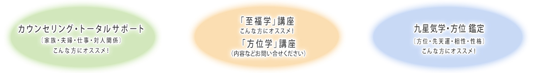 ◎至福学にプラスして、更に運を良くしたい ◎引っ越し、旅行先などの吉方位を知りたい ◎引っ越し、旅行などをいつしたらいいか知りたい ◎先天的(潜在的)な自身の強みを知りたい ◎本質的な相性を知りたい (結婚相手、上司・部下、親子など) ◎客観的に自身が、どのような性格、 価値観なのか把握したい ◎今年の運気 ◎九年間の運気の流れ |