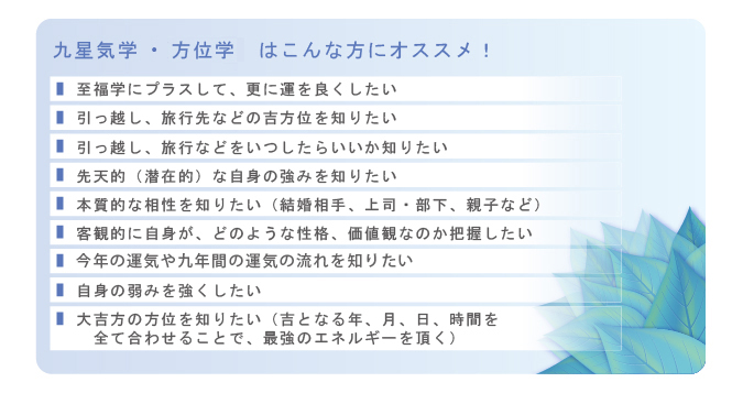 この歴史ある九星気学・方位学は、「動の開運学」ともいわれ、先天運を知った上で、自らが行動することで、後天運を更に良くすることが可能になります。