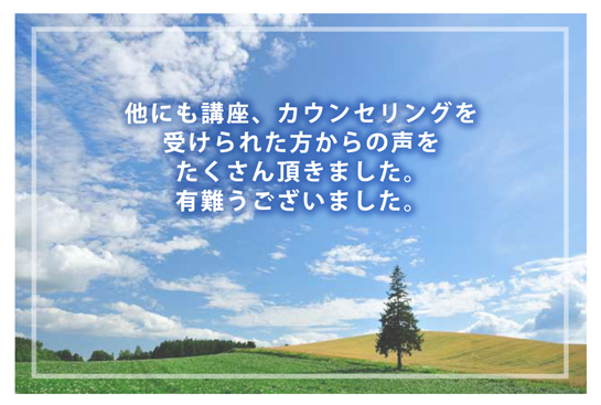 講座の内容が難しいかなと思ったが、分かりやすく面白く、毎回あっという間に時間が経った。最近シンクロニシティ体験が増えてきて、目に見えない世界に興味が持てるようになった。これからが楽しみ。切り替えが早くなり、人や事柄に対しても悪く考えないようになった。